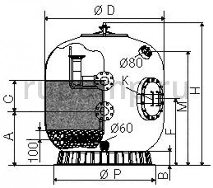 Фильтр песочный для общественных бассейнов Pool King серия К д. 1800мм 125куб.м/час, подкл. 6", сопл., доп.опции