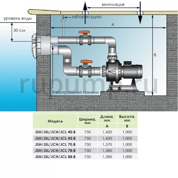Комплект встраиваемого противотока HidroJet JSL-40 состоит циркулярного насоса, закладного элемента, щита управления с пневмовключением, соединительных фитингов.