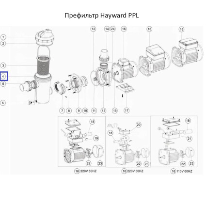 Префильтр Hayward PPL. Применяется для задержки крупного мусора во избежание попадания его на крыльчатку насоса. Максимальное рабочее давление 1,5 бар. Закрытие крышки префильтра выполняется 4 винтами. Префильтр изготовлен из ламинированного полиэстера, прозрачная крышка префильтра из метакрилата, а корзина - из нержавеющей стали.